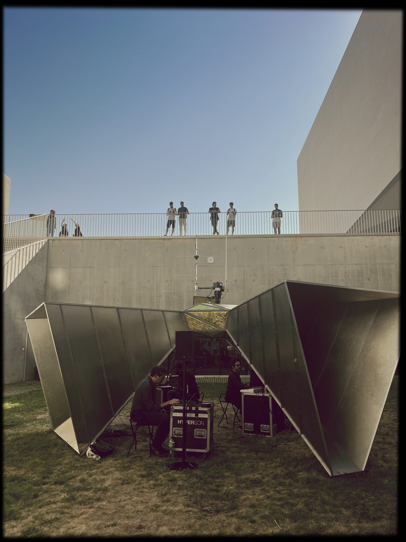 Ainsi, Hystérésia capte un fond diffus cosmique. Pour ce faire, une antenne centrale est utilisée, dont la fonction est de repérer chaque satellite de manière ultra-précise. Nous entendons une annonce. La machine se connecte à l’un des satellites en temps réel. L’antenne change de position selon des coordonnées GPS. La connexion est établie avec OSCAR, ISIS, SOLRAD, SECOR… Commence alors un concert, une symphonie de chants intersidéraux, pour un voyage astral souvent psychédélique. Les nappes sonores peuvent renvoyer autant à de la musique technologique qu’à des chants liturgiques. Les voix envoutantes des sirènes propulsent directement dans les profondeurs du cosmos, vers des contrées abyssales et stellaires.
